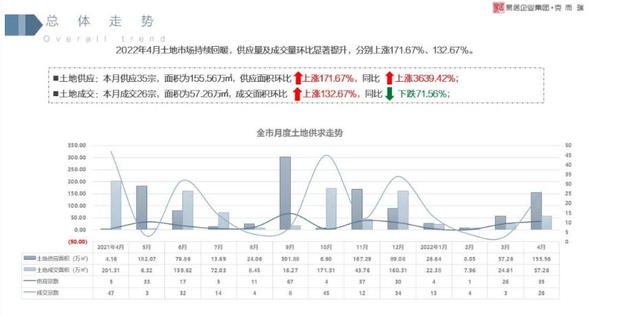 此种“停摆”的状态一直到了3月份才开始回暖,供应量和成交量环比都处于上涨状态,分别上涨了611%、209%。本月一共应了26宗地,其中住宅2宗商办18宗、商住6宗。但对比来看成交量还是要少于供应量,只有3宗。亩单价大概为1004万元/亩,楼板价在5732元/平方米,比主城区的楼板价要低一些,与同期的2021年相比涨幅较大。
